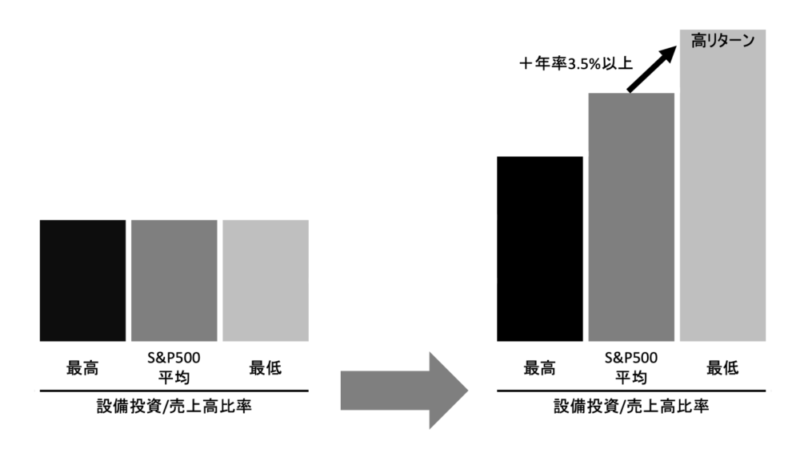 一方、設備投資に資源を割かない企業は、過去約半世紀にわたり、S&P500種平均 を年率3.5%以上上回る飛び抜けて高いリターンを達成しました。
