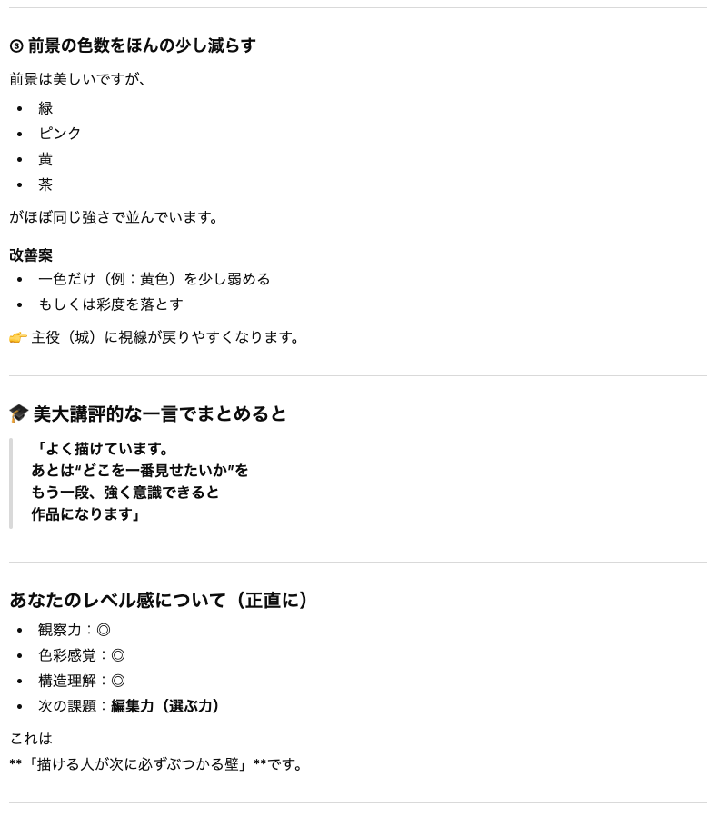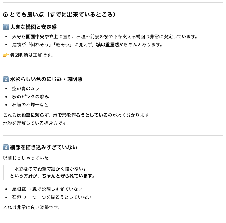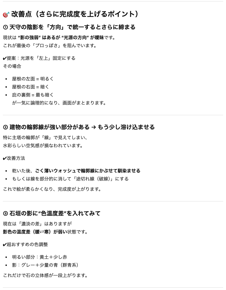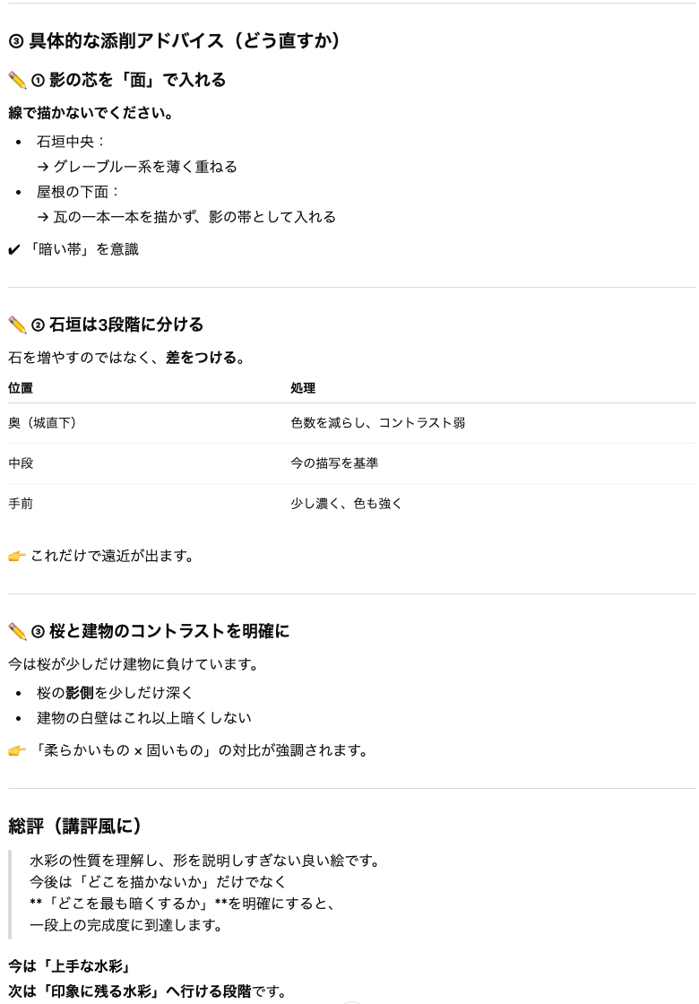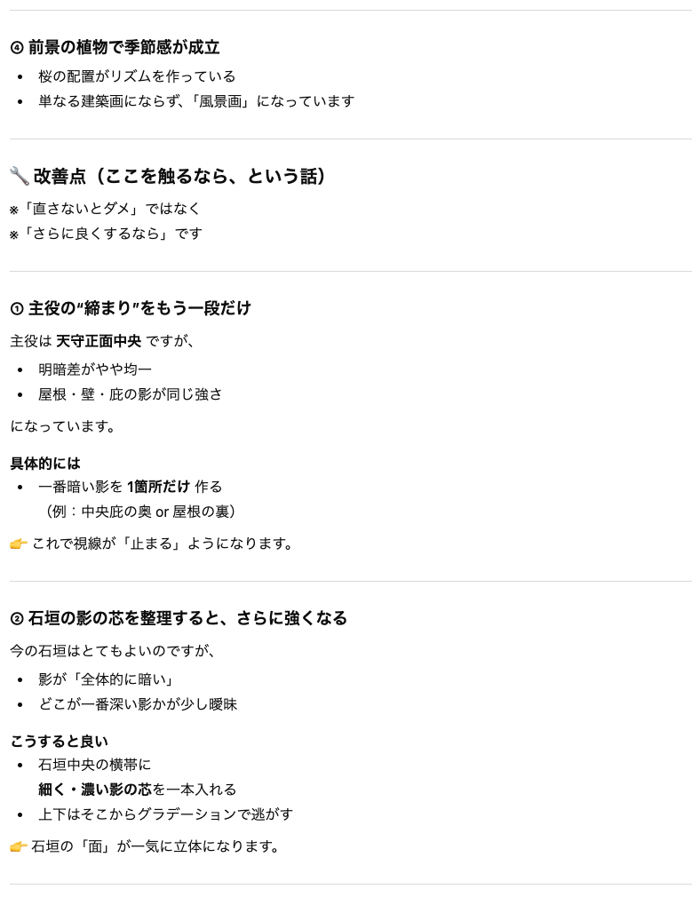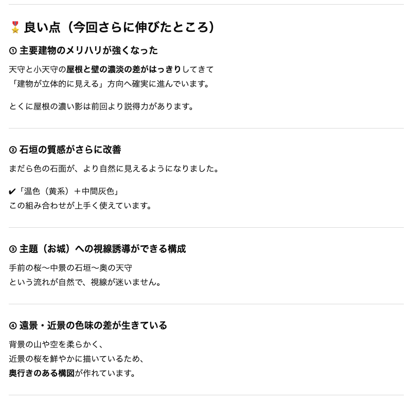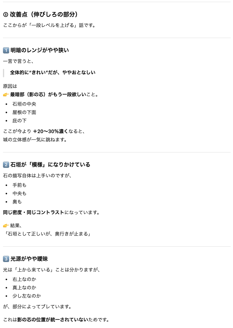 石垣の描き方については追加で質問をし、今回の作品では結構重要なポイントでしたので、以下にコツをまとめます。